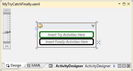 tags. XAMLThe activity designer should look similar to the following figure:<sap:ActivityDesigner ...><StackPanel><Border BorderBrush="Green" BorderThickness="4" CornerRadius="5"><sap:WorkflowItemPresenter Item="{Binding Path=ModelItem.Try, Mode=TwoWay}" HintText="Insert Try Activities Here"/></Border><Border BorderBrush="Black" BorderThickness="4" CornerRadius="5"><sap:WorkflowItemPresenter Item="{Binding Path=ModelItem.Finally, Mode=TwoWay}" HintText="Insert Finally Activities Here"/></Border></StackPanel></sap:ActivityDesigner ...> - Save the activity and close the file.